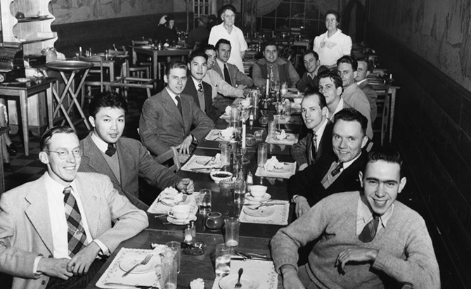 Pictured: Loring Mandel (at far end on right) with fellow boarders and landladies on North Lake Street in Madison, circa 1946.