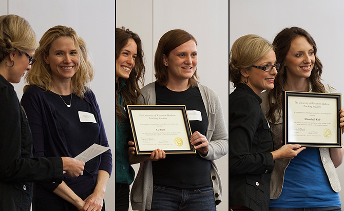 The induction ceremony was held in the Education Building’s Wisconsin Idea Room Thursday evening, April 24th. Professor Lyn Van Swol was inducted as a Teaching Academy Fellow, and teaching assistants Liz Barr and Miranda Kolb were inducted as Teaching Academy Future Faculty Partners (FFPs).