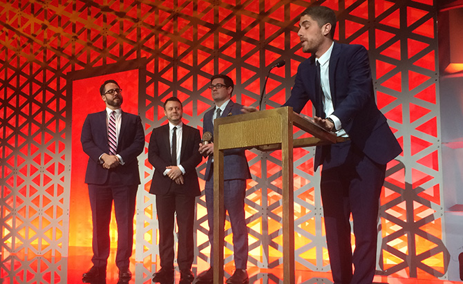 Pictured from left to right: Joe Farrell, Ari Lubet, Daniel Perrault, and Tony Yacenda on stage accepting a Peabody Award for the show American Vandal.
